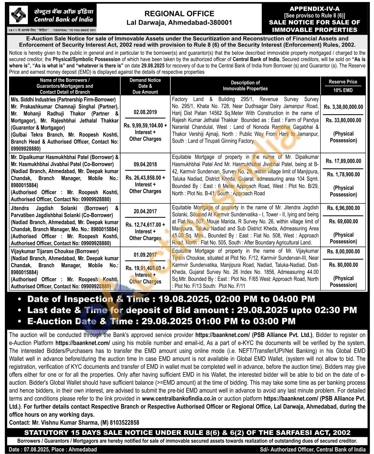 Contact (Authorised Officer Mr. Roopesh Koshti, Authorised Officer, Contact No: 09909928880