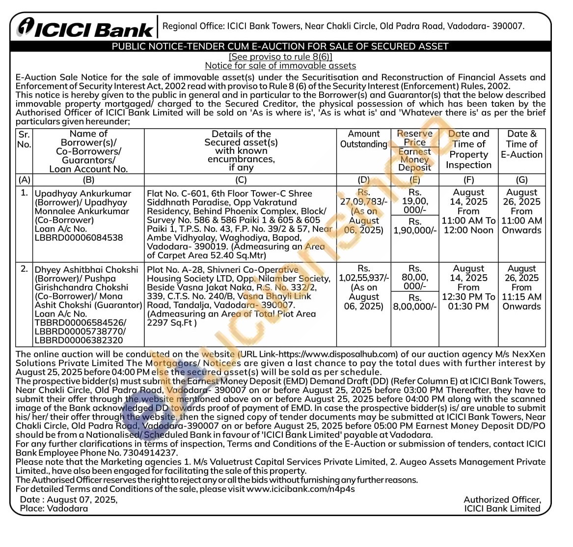 1) Flat No. C-601, 6th Floor Tower-C Shree Siddhnath Paradise, Opp Vakratund Residency, Behind Phoenix Complex, Block/Survey No. 586 & 586 Paiki 1 & 605 & 605 Paiki 1, T.P.S. No. 43, F.P. No. 39/2 & 57, Near Ambe Vidhyalay, Waghodiya, Bapod, Vadodara-390019. (Admeasuring an Area of Carpet Area 52.40 Sq.Mtr