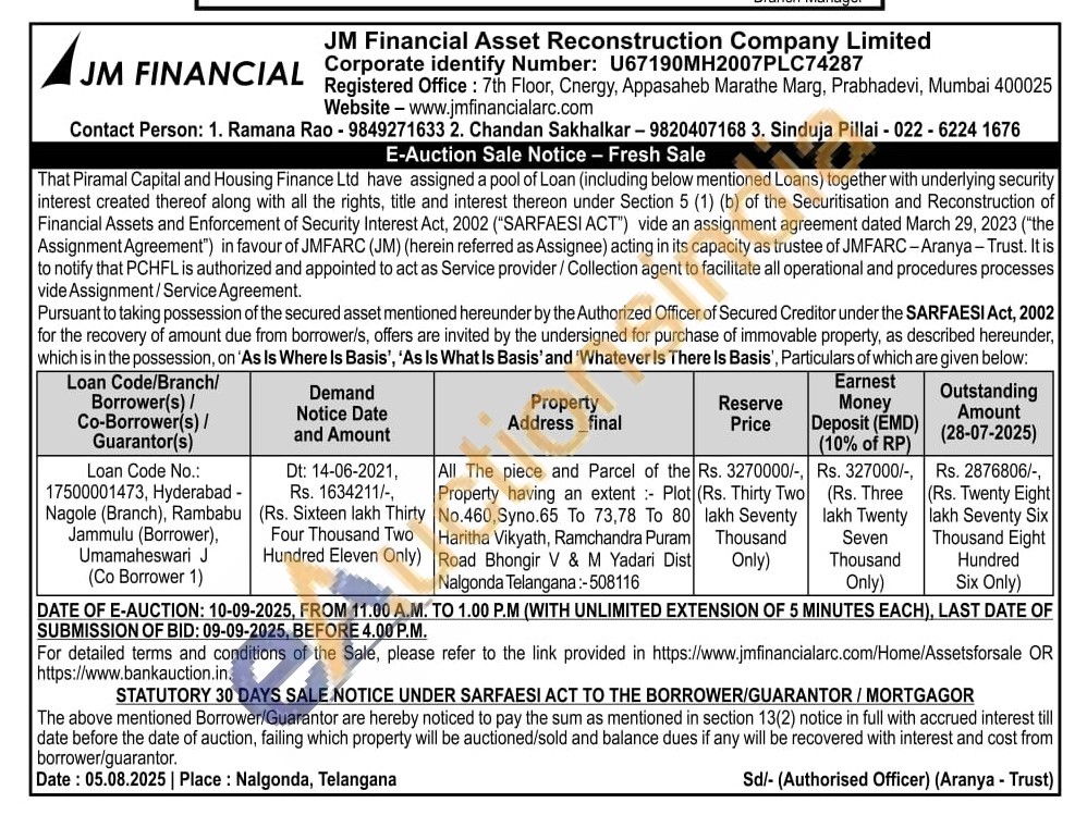 All The piece and Parcel of the Property having an extent: Plot No.460, Syno.65 To 73,78 To 80 Haritha Vikyath, Ramchandra Puram Road Bhongir V & M Yadari Dist Nalgonda Telangana:-508116