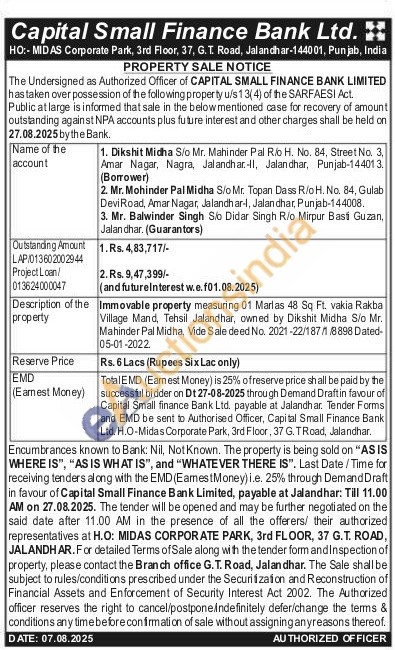 Immovable property measuring 01 Marlas 48 Sq Ft. vakia Rakba Village Mand, Tehsil Jalandhar, owned by Dikshit Midha S/o Mr. Mahinder Pal Midha, Vide Sale deed No. 2021-22/187/1/8898 Dated-05-01-2022.