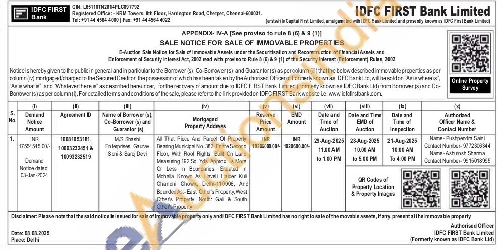 All That Piece And Parcel Of Property Bearing Municipal No. 383, Entire Second Floor, With Roof Rights, Built On Land Measuring 192 Sq. Yds. Approx., Is More Or Less In Boundaries, Situated In Mohalla Known As Haveli Haider Kuli, Chandni Chowk, Delhi-110006, And Bounded As:- East: Other's Property, West: Other's Property, North: Galli & South: Other's Property