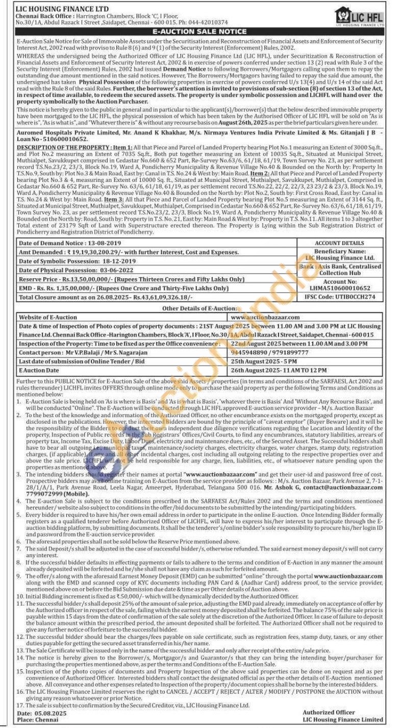 All that Piece and Parcel of Landed Property bearing Plot No.1 measuring an Extent of 3000 Sq.ft and Flot No.2 measuring an Extent of 7035 Sqft, Both put together measuring an Extent of 10035 Suft., Situated at Municipal Street, Muthialpet, Savukkupet comprised in Ceslastar No.660 6 652 Part. Re-Survey No.63/6, 61/18, 61/19, Town Sarvey No. 23, as per settlement record TS.No.23/2, 23/3, Black No.19, Ward A, Pundicherry Municipality & Revenus Village No.40 & Hounded on the North by: Property In TS No.9, South by: Plot No.3.& Main Road, East by: Camal in TS. No.24 & West by: Main Road. Item 21 All that Piece and Parcel of Landed Property hearing Plot No.3 & 4, measuring an Extent of 10000 Sq. ft. Situated at Municipal Street, Muthialpet, Savukkupet, Muthialpet, Cumprised in Cedastar No.660 & 652 Part, Re-Survey No. 63/6, 61/18, 61/19, as per settlement record TS No.22.22/222/3, 23 23/2 & 23/3 Block No. 19, Ward A. Pondicherry Municipality & Revenue Village No.40 & Bou Bounded on the North by: Plot No. No.2, South by: First First Cross Cross Road, Road, East by. Canal in TS No 24 & West by: Main Road Item 3: All that Piece and Parcel of Landed Property bearing Plot No.5 measuring an Extent of 3144 5q. ft. Situated at Municipal Street, Muthialpet, Savukkupet, Muthialper, Comprised in Cedastar No.660652 Part, Re-Survey No. 63/6.61/18.61/19. Town Survey No. 23, as per settlement record TS.No.23/2, 23/3, Block No.19, Ward A., Pondicherry Municipality & Revenue Village No.40 & Bounded on the North by: Road, South by: Property in T.S. No. 21. East by: Main Road & West by: Property in T.S. No. 11. All items 1 to 3 altogether Total extent of 23179 Suft of Land with Superstructure erected thereon. The Property is Lying within the Sub Registration District of Pondicherry and Registration District of Pondicherry.