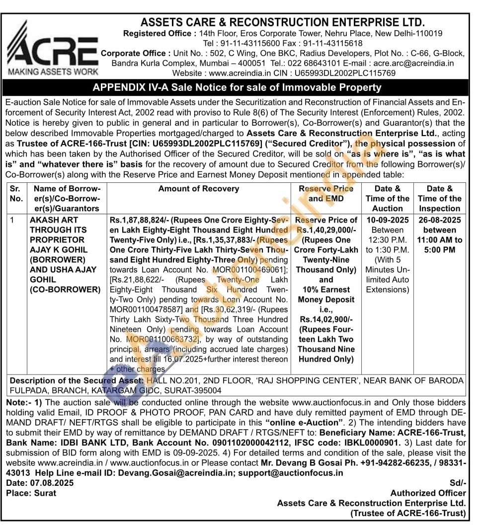 HALL NO.201, 2ND FLOOR, 'RAJ SHOPPING CENTER', NEAR BANK OF BARODA FULPADA, BRANCH, KATARGAM GIDC, SURAT-395004