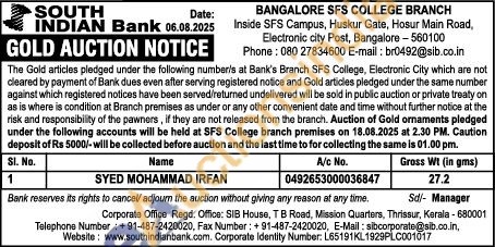 South Indian Bank Gold Auctions Auction in Bengaluru