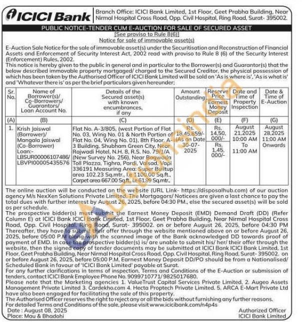 Flat No. A-3/805, (west Portion of Flat No. 03, Wing No. 01 & North Portion of Flat No. 04, Wing No. 01), 8th Floor, A-3 Building. Shubham Green City, Near Rajwadi Hotel, N.H. 8, R.S. No. 79/1/A (New Survey No. 256), Near Bagwada Toll Plazza, Tighra, Pardi, Valsad, Vapi 336191 Measuring Area: Super Builtup area 102.23 Sq.mtr., Le 1100.00 Sq.ft.. Carpet area 667.00 Sq.ft. le 61.99 Sq.mtr.
