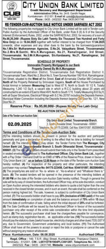 Tiruvannamalai Registration District, Tiruvannamalai Sub Registration District II. Tiruvannamalai Town, Ward No. 2. Block No.5, Town Survey Number 190/16-A, Ramalinganar 3rd Street, situated to the West of the Street, East of Annamalai Chettiar Mill Compound North of the Property Retained by Srinivasan Vagaira, South of the House Purchased by Andal Ammal in between Measuring East to West 67 ft, North to South 18 1/2 ft. Totally Measuring 1,240 1/2 Sq.ft a vacant site in which a R.CC building about 20 years old constructed to an extent of East to West 49 ft. North to South 17 ft. Totally Measuring 833 Sq.ft. with all Super Structures, Electrical Fittings with S.C. No. 20787 including the Deposits thereon, Municipal Water Connection including the Deposits thereon bearing Old Door No. 12/1, New Door No.21.