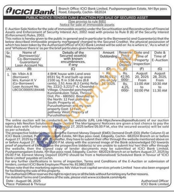 4 BHK house with Land area 6531 Sq. ft and built-up area 2100 sq ft in 3.56 Ares (9.8 cents), 2.51 Ares (6.2 Cents) ReSy No. 222/2-3,221/7-4, Choondal Village, Choondal panchayath, Kunnamkulam Taluk, Thrissur Dist. Pin-680502. Bounded on the North: 12 Feet pathway South: Property of Purushothaman and my own property East: 12 Feet pathway West: Property of Purushothaman