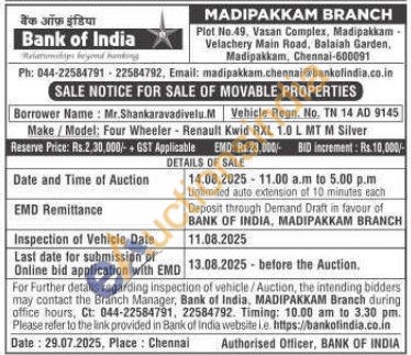 Contact Ph: 044-22584791-22584792, Email: madipakkam.chennai@bankofindia.co.in