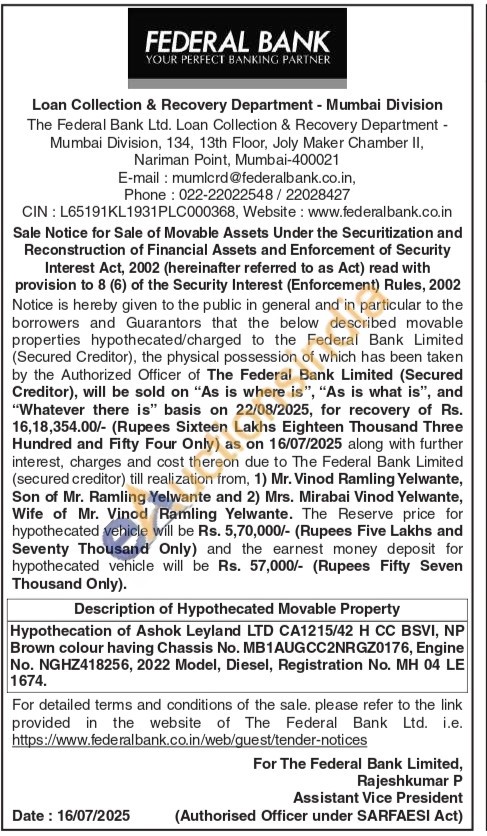Contact E-mail: mumlcrd@federalbank.co.in, Phone: 022-22022548/22028427