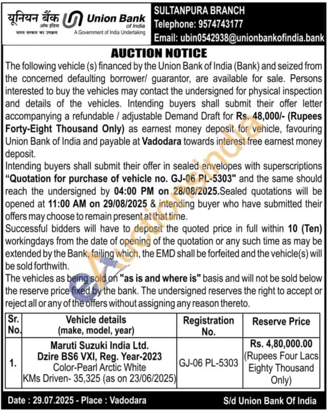 Vehicle details (make, model, year) : Maruti Suzuki India Ltd. Dzire BS6 VXI, Reg. Year-2023 Color-Pearl Arctic White KMs Driven-35,325 (as on 23/06/2025