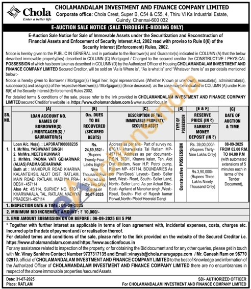 Contact Mr. Vinay Sankhre Contact Number 9737317135 and Email:vinaysb@chola.murugappa.com/Mr. Ganesh Ram on 96770