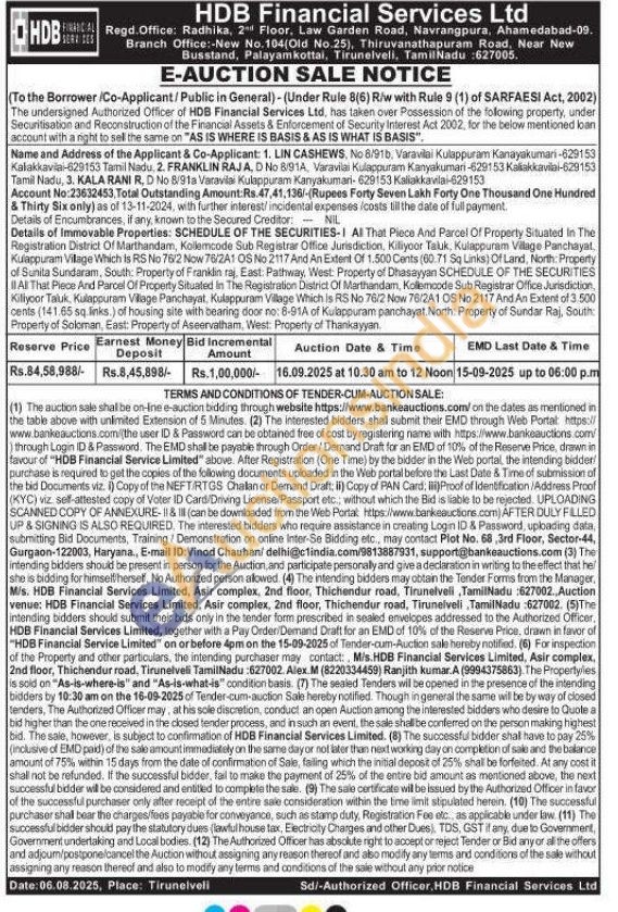 All That Piece And Parcel Of Property Situated in The Registration District Of Marthandam, Kollemcode Sub Registrar Office Jurisdiction, Kiliyoor Taluk, Kulappuram Village Panchayat Kulappuram Village Which is RS No 76/2 Now 76/2A1 OS No 2117 And An Extent Of 1.500 Cents (60.71 Sq Links) Of Land, North: Property of Sunita Sundaram, South: Property of Franklin raj, East. Pathway, West: Property of Dhasayyan SCHEDULE OF THE SECURITIES All That Piece And Parcel Of Property Situated in The Registration District Of Marthandam, Kollemoode Sub Registrar Office Jurisdiction, Kiliyoor Taluk, Kulappuram Village Panchayat, Kulappuram Village Which is RS No 76/2 Now 76/2A1 OS No 2117 And An Extent of 3.500 cents (141.65 sq. links.) of housing site with bearing door no: 8-91A of Kulappuram panchayat. North: Property of Sundar Raj, South Property of Sokman, East: Property of Aseervatham, West: Property of Thankayyan