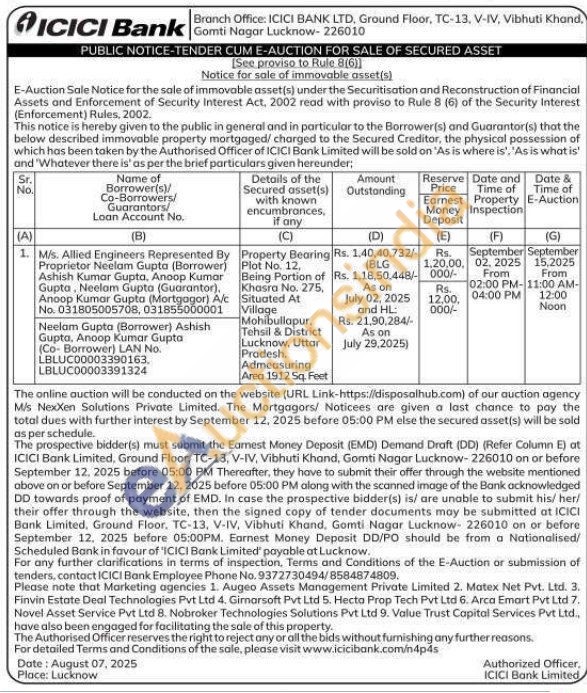 Property Bearing Plot No. 12, Being Portion of Khasra No. 275, Situated At Village Mohibullapur, Tehsil & District Lucknow, Uttar Pradesh. Admeasuring Area 1912 Sq. Feet