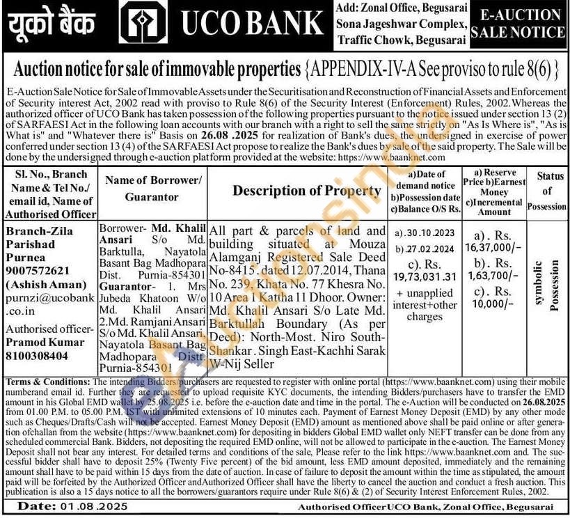 All part & parcels of land and building situated at Mouza Alamganj Registered Sale Deed No-8415. dated 12.07.2014, Thana No. 239, Khata No. 77 Khesra No. 10 Area 1 Kattha 11 Dhoor. Owner: Md. Khalil Ansari S/o Late Md. Barktullah Boundary (As per Deed): North-Most. Niro South-Shankar. Singh East-Kachhi Sarak W-Nij Seller