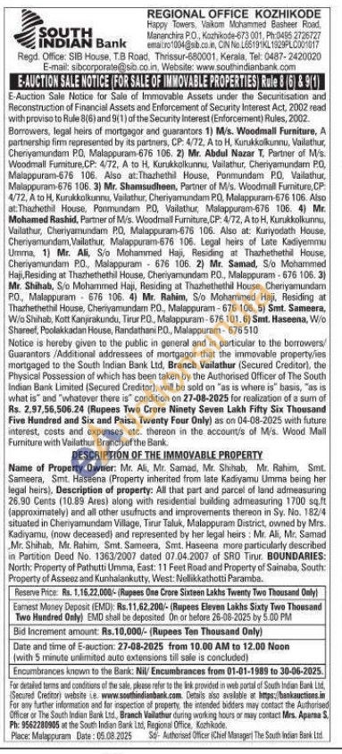 All that part and parcel of land admeasuring 26.90 Cents (10.89 Ares) along with residential building admeasuring 1700 sq.ft (approximately) and all other usufructs and improvements thereon in Sy. No. 182/4 situated in Cheriyamundam Village, Tirur Taluk, Malappuram District, owned by Mrs. Kadiyamu, (now deceased) and represented by her legal heirs: Mr. Ali, Mr. Samad Mr. Shihab, Mr. Rahim, Smt. Sameera, Smt. Haseena more particularly described in Partition Deed No. 1363/2007 dated 07.04.2007 of SRO Tirur. BOUNDARIES: North: Property of Pathutti Umma, East: 11 Feet Road and Property of Sainaba, South: Property of Asseez and Kunhalankutty, West: Nellikkathotti Paramba.