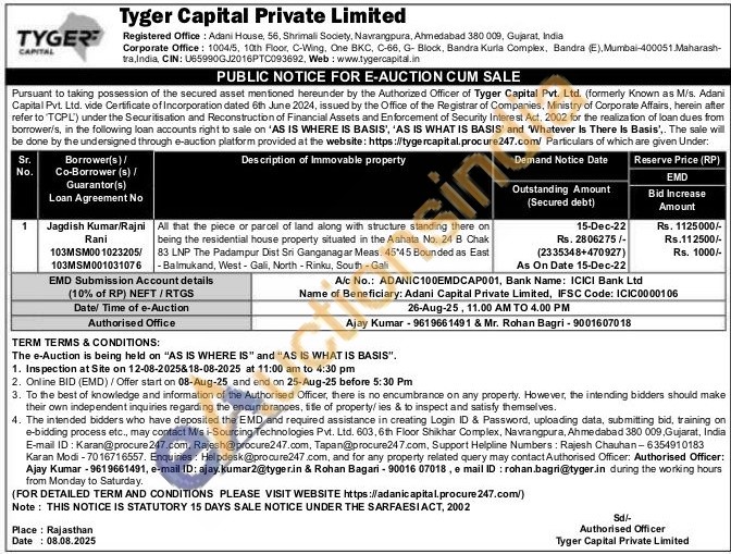 Authorised Officer: Ajay Kumar-9619661491 / Mr. Rohan Bagri - 9001607018