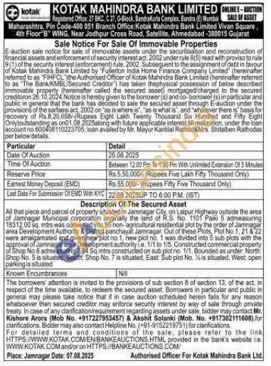 All that piece and parcel of property situated in Jamnagar City, on Lalpur Highway outside the area of Jamnagar Municipal corporation onginally the land of R.S. No. 1101 Palki 5 admeasuring 18312.00 sq. mirs was converted into 95 non-agricultural residential plot by the order of Jamnagar area Development Authority & District panchayat Jamnagar. Out of these Plots, Plot No 1, 21 & 22 were amalgamated and given new plot no.1, new plot no. 1 was divided into 5 sub plots with the approval of Jamnagar area Development authoritye. e. 1/1 to 1/5. Constructed commercial property of Shop No.6 6 admeasuring 7.84 Sq mtrs constructed on sub plot no 1/1. Bounded as as u under, North Shop No. 5 is situated. South, Shop No. 7 is situated. East: Sub plot No. 4 is situated, West: open parking is situated