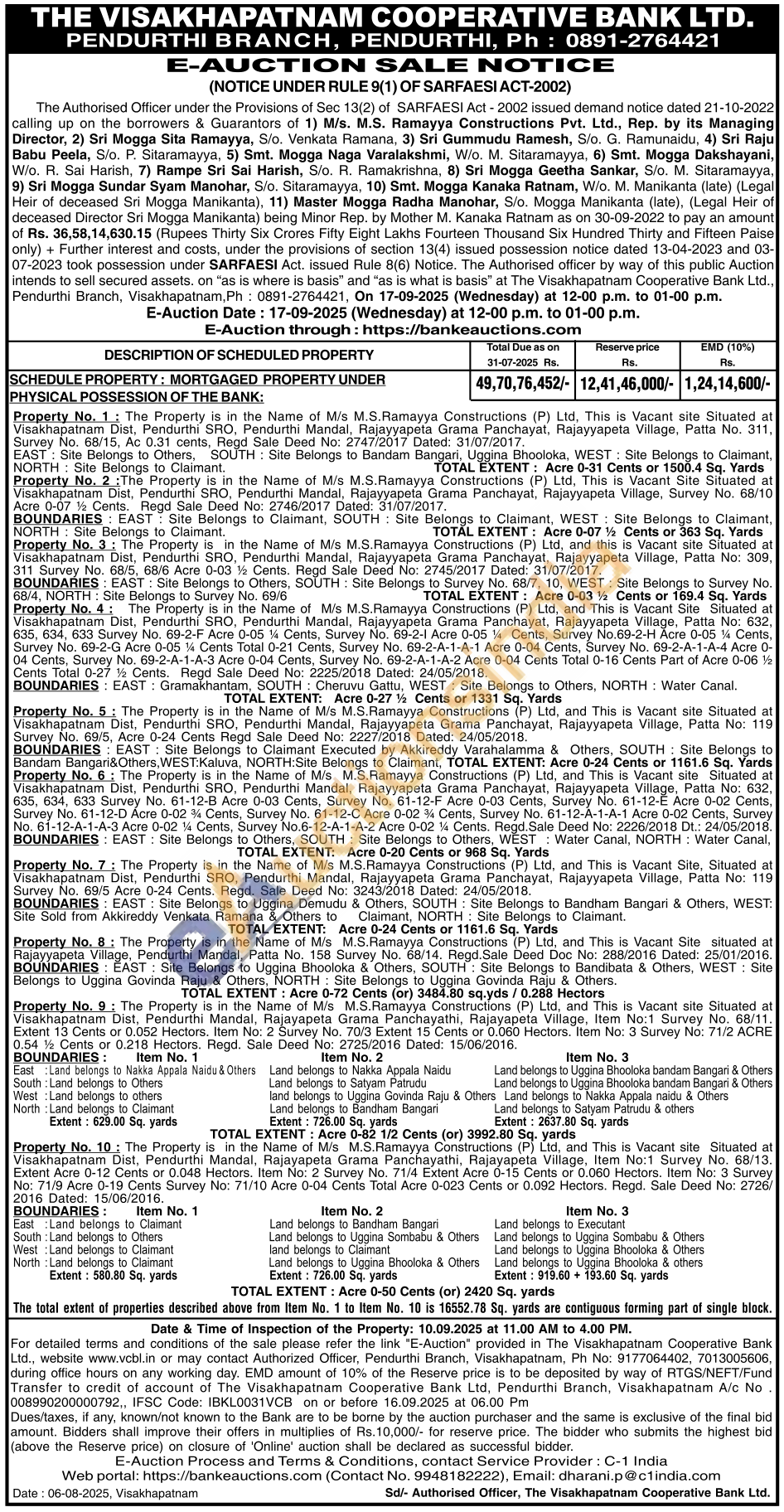 Property No. 2: The Property is in the Name of Mis M.S.Hamayya Constructions (P) Ltd. This is Vacant Site Situated at Visakhapatnam Dist, Pendurthi SRO, Pendurthi Mandal, Rajayyapeta Grama Panchayat. Rajayyapeta Village, Survey No. 68/10 Acre 0-07 1½ Cents. Hegd Sale Deed No: 2746/2017 Dated: 31/07/2017. BOUNDARIES: EAST Site Belongs to Claimant, SOUTH Site Belongs to Claimant, WEST: Site Belongs to Claimant, NORTH Site Belongs to Claimant. the Name of Mis M.S.Ramayya Constructions (P) Ltd, and this is Vacant site Situated at andurthi Mandal, Rajayyapeta Grama Panchayat, Rajayyapeta Village, age, Patta 309. TOTAL EXTENT: Acre 0-07% Cents or 363 Sq. Yards No