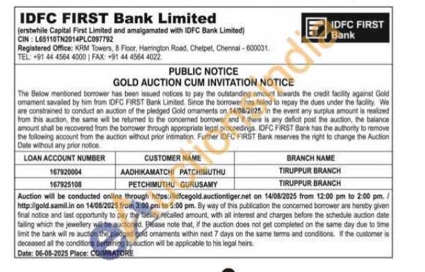IDFC First Bank Ltd Gold Auctions Auction in Kolkata