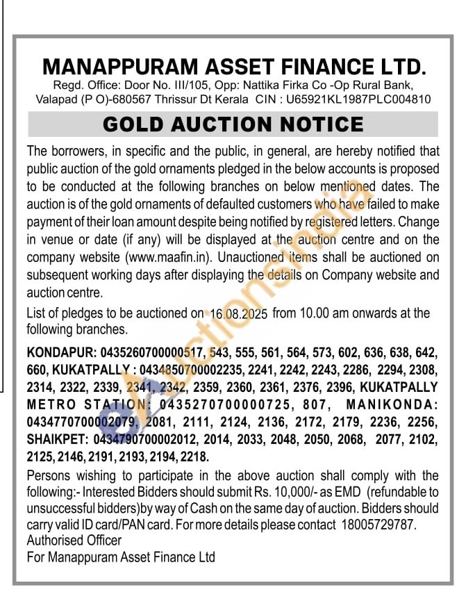 Manappuram Asset Finance Ltd Gold Auctions Auction in Hyderabad
