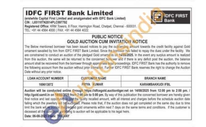 IDFC First Bank Ltd Gold Auctions Auction in Chennai