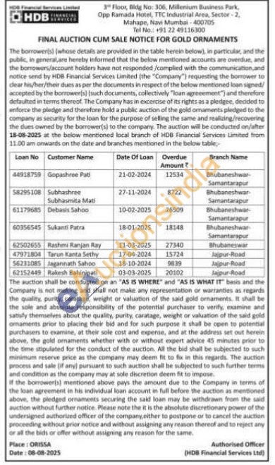 HDB Financial Services Limited Gold Auctions Auction in Bhubaneswar