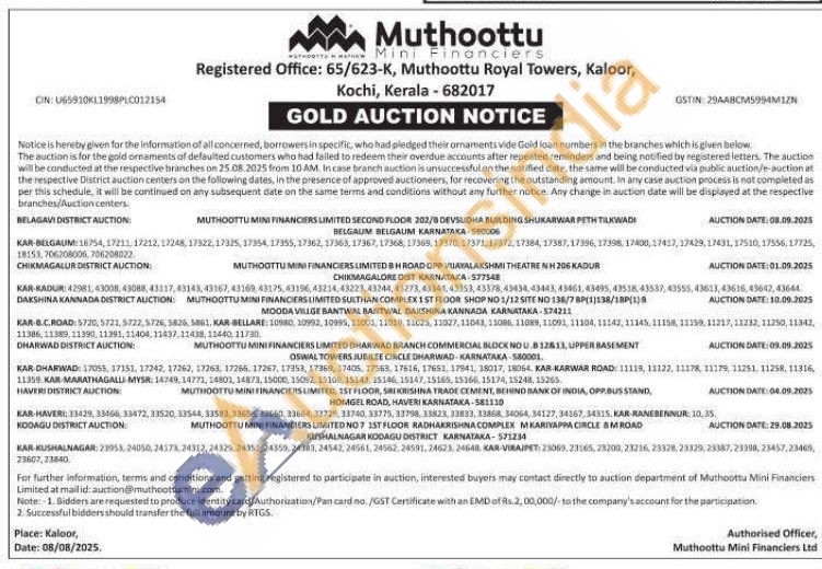 Muthoottu Mini Financiers Limited Gold Auctions Auction in Belagavi