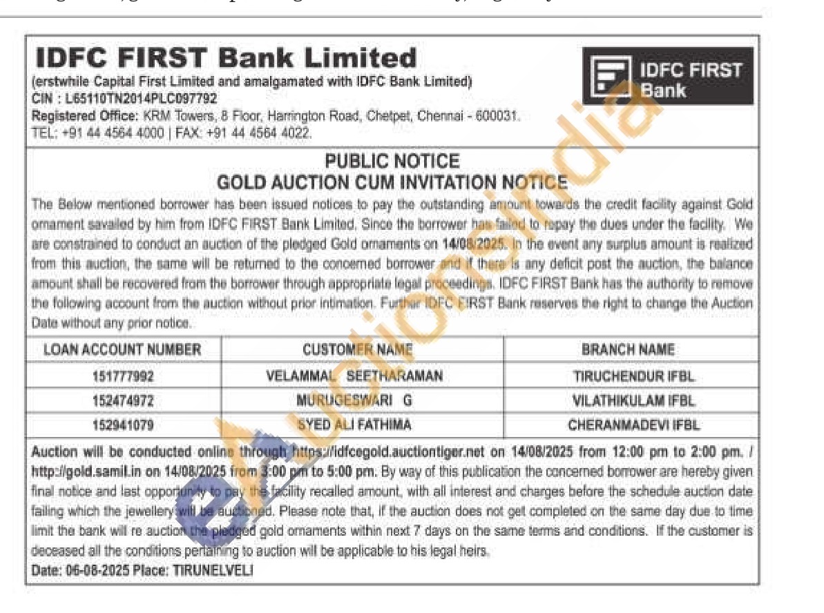 IDFC First Bank Ltd Gold Auctions Auction in Tirunelveli