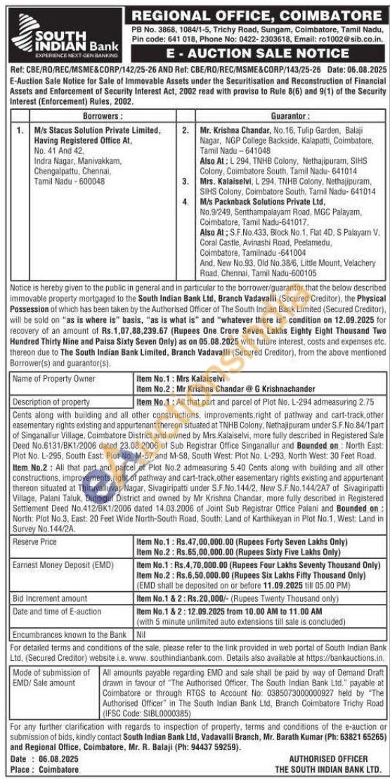 All that part and parcel of Plot No. L-294 admeasuring 2.75 Cents along with building and all other constructions, improvements, right of pathway and cart-track, other easementary rights existing and appurtenant thereon situated at TNHB Colony, Nethajipuram under S.F.No.84/1 part of Singanallur Village, Coimbatore District and owned by Mrs Kalaiselvi, more fully described in Registered Sale Deed No.6131/BK1/2006 dated 23.08.2006 of Sub Registrar Office Singanallur and Bounded on: North East: Plot No. L-295, South East Plot No. M-57 and M-58, South West: Plot No. L-293, North West: 30 Feet Road.