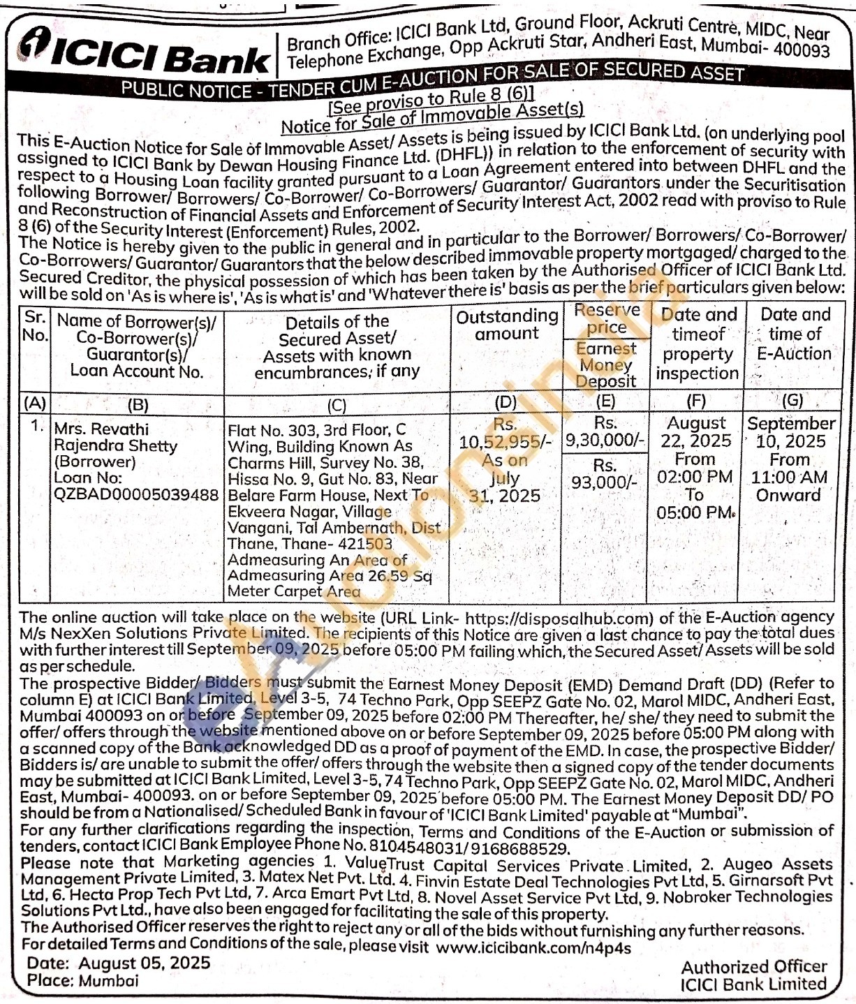 Flat No. 303, 3rd Floor, C Wing, Building Known As Charms Hill, Survey No. 38, Hissa No. 9, Gut No. 83, Near Belare Farm House, Next To Ekveera Nagar, Village Vangani, Tal Ambernath, Dist Thane, Thane-421503 Admeasuring An Area of Admeasuring Area 26.59 Sq Meter Carpet Area
