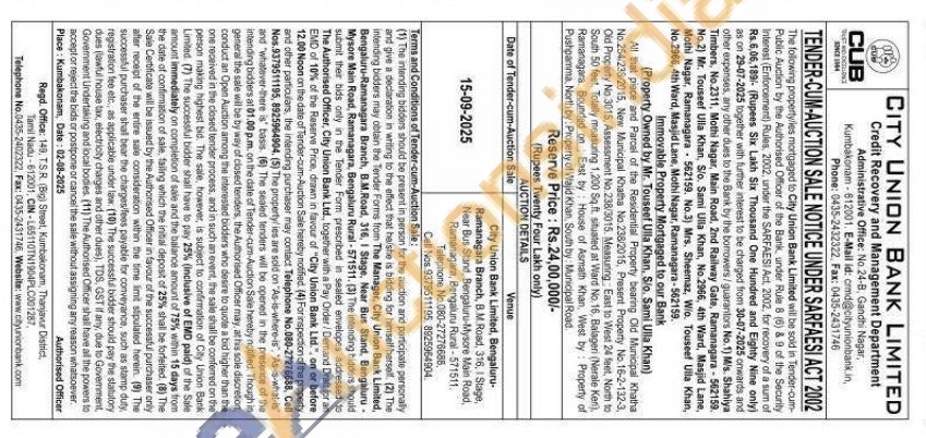 All that piece and Parcel of the Residential Property bearing Old Municipal Khatha No.254/238/2015, New Municipal Khatha No.238/2015, Present Property No. 16-2-132-3, Old Property No 3015, Assessment No. 238/3015. Measuring East to West 24 feet, North to South 50 feet, Totally measuring 1,200 Sq.ft. situated at Ward No. 16, Balageri (Nerale Ken), Ramanagara. Bounded on East by House of Asmath Khan, West by Property of Pushpamma, North by: Property of Wajid Khan, South by: Municipal Road