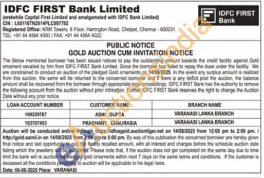 IDFC First Bank Ltd Gold Auctions Auction in Chennai