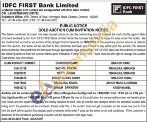 IDFC First Bank Ltd Gold Auctions Auction in Chennai