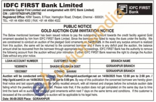 IDFC First Bank Ltd Gold Auctions Auction in Chennai