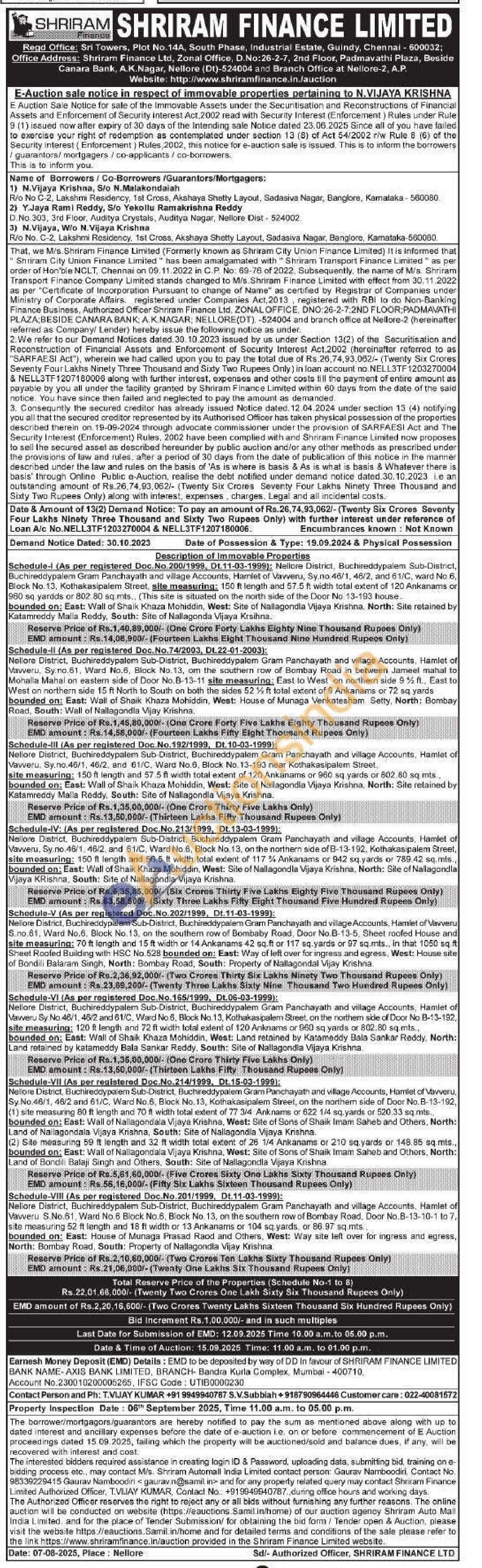 Schedule-VII (As per registered Doc. No.214/1999, Dt.15-03-1999): Nellore District, Buchireddypalem Sub-District, Buchireddypalem Gram Panchayath and village Accounts, Hamlet of Vavveru, Sy.No.46/1, 46/2 and 61/C, Ward No.6, Block No. 13, Kothakasipalem Street, on the northem side of Door No. B-13-192, (1) site measuring 80 ft length and 70 ft width total extent of 77 3/4 Anknams or 622 1/4 sq.yards or 520.33 sq.mts.. bounded on: East: Wall of Nallagondala Vijaya Krishna, West: Site of Sons of Shaik Imam Saheb and Others, North: Land of Nallagondala Vijaya Krishna, South: Site of Nallagondila Vijaya Krishna. (2) Site measuring 59 ft length and 32 ft width total extent of 26 1/4 Ankanams or 210 sq.yards or 148.85 sq.mts.. bounded on: East: Wall of Nallagondala Vijaya Krishna, West: Site of Sons of Shaik Imam Saheb and Others, North: Land of Bondili Balaji Singh and Others, South: Site of Nallagondla Vijaya Krishna.