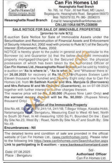 Description of the Immovable Property : Site No.48, Sy. No. 241/5/241/1A, 241/18, T.Begur Village, Kasaba Hobli, Nelamangala Taluk, Bengaluru, Measuring East to West 40 feet, North to South 30 Feet. In All measuring 1200 Sq Ft. Bounded On the East By Site No.23, West By: Road, North By Site No.47 and South By: Site No.49
