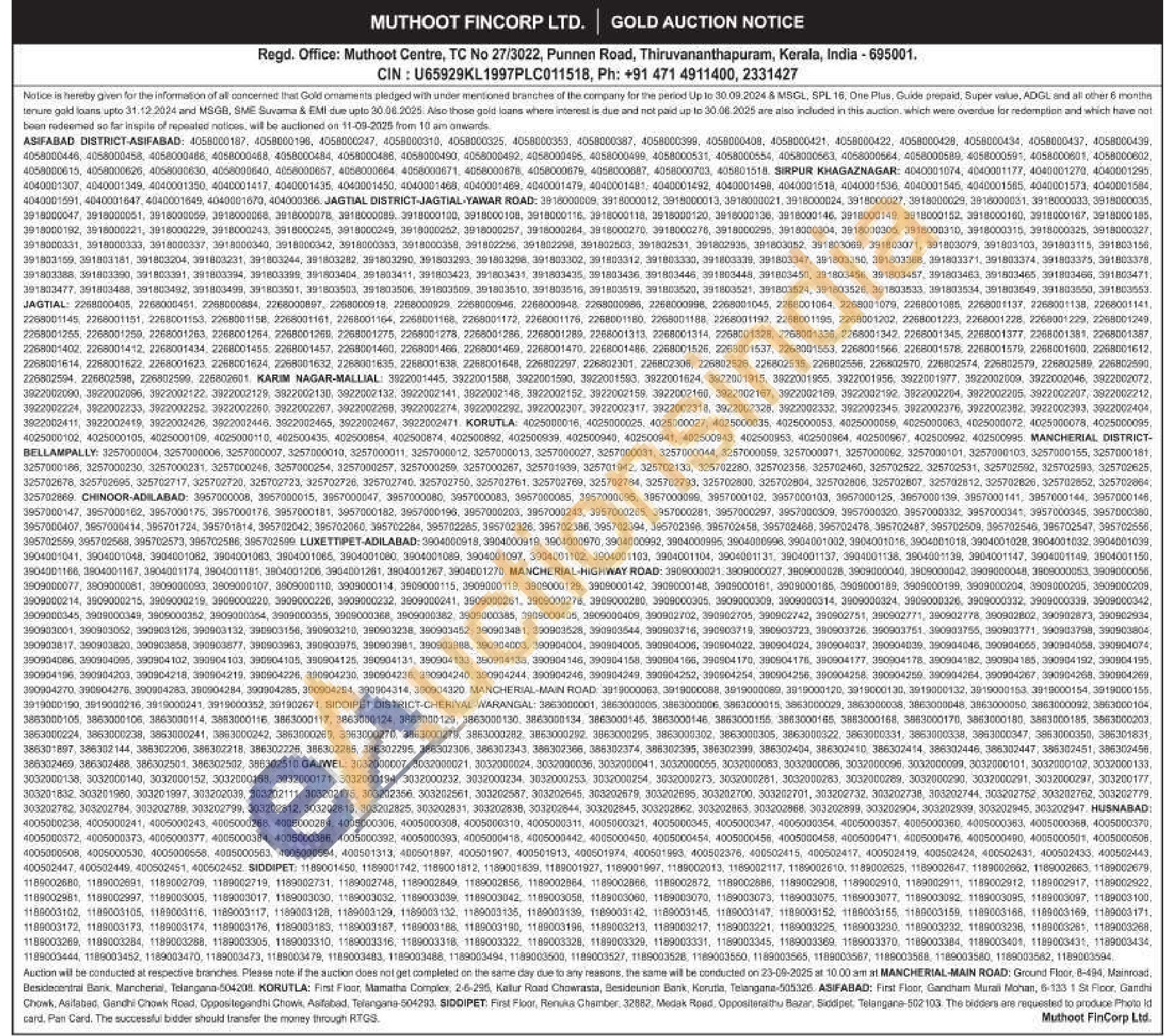 Muthoot Fincorp Ltd Gold Auctions Auction in Adilabad