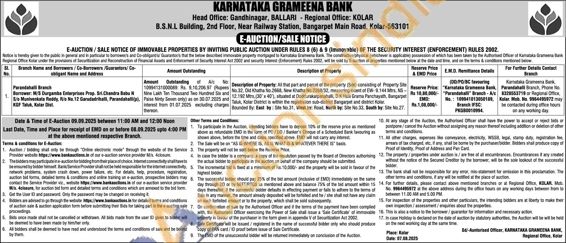 Parandahalli Branch Phone No : 8328553719 / Regional Office Kolar. Mobile No : 9964495972