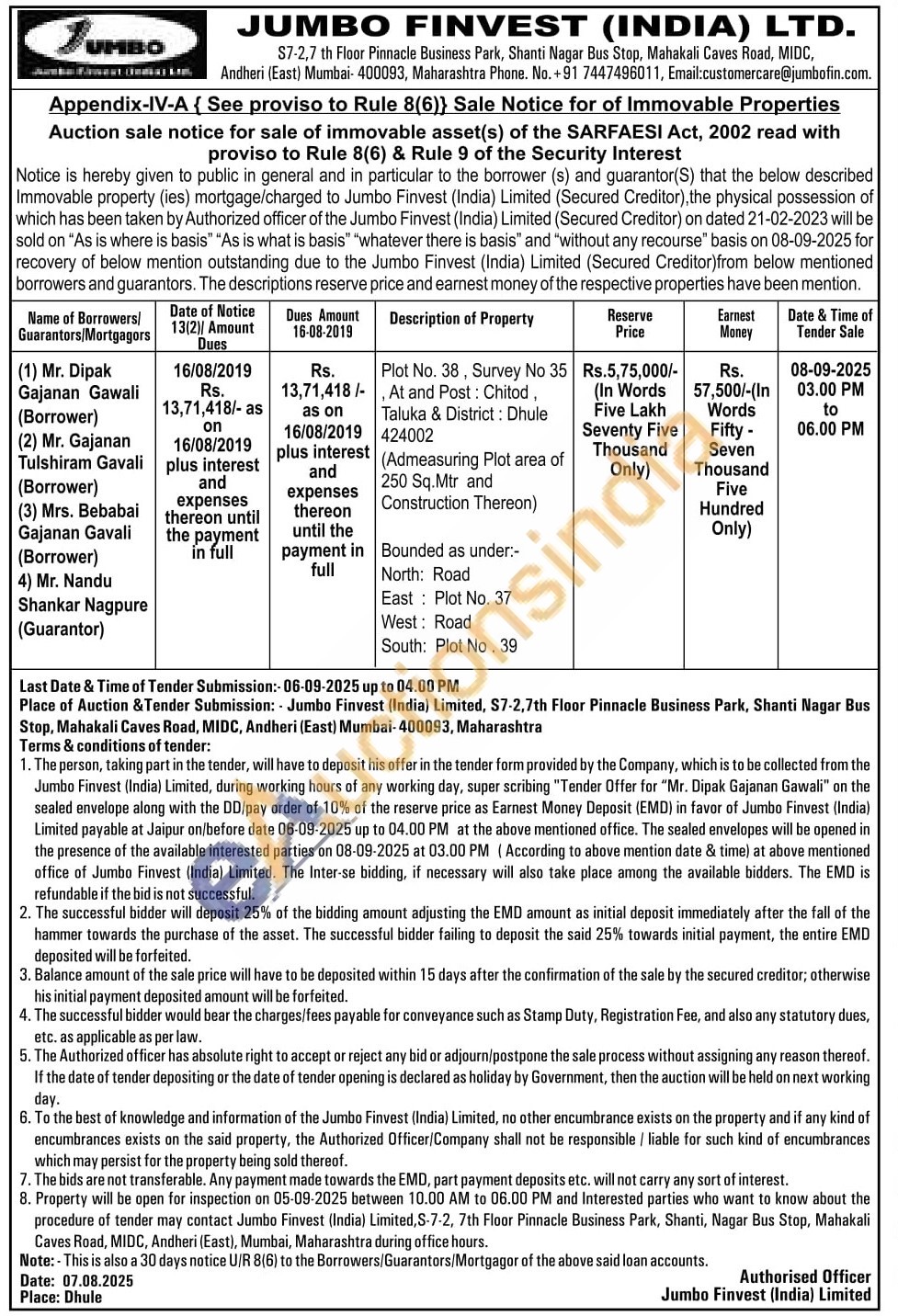 Plot No. 38, Survey No 35 , At and Post: Chitod, Taluka & District: Dhule 424002