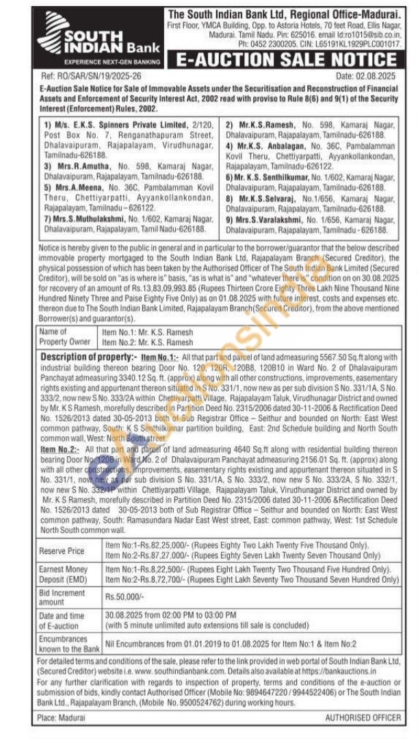 Description of property: Item No.1:- All that part and parcel of land admeasuring 5567.50 Sq.ft along with industrial building thereon bearing Door No. 120, 120R, 12088, 120810 in Ward No. 2 of Dhalavaipuram Panchayat admeasuring 3340.12 Sq. ft. (approx) along with all other constructions, improvements, easementary rights existing and appurtenant thereon situated in S No. 331/1, now new as per sub division S No. 331/1A, SNo. 333/2, now new 5 No. 333/2A within Chettiyarpatti Village, Rajapalayam Taluk, Virudhunagar District and owned by Mr. KS Flamesh, morefully described in Partition Deed No. 2315/2006 dated 30-11-2006 & Rectification Deed No. 1526/2013 dated 30-05-2013 both of Sub Registrar Office Seithur and bounded on North: East West common pathway, South: KS Senthilkumar partition building, East: 2nd Schedule building and North South common wall, West: North South street