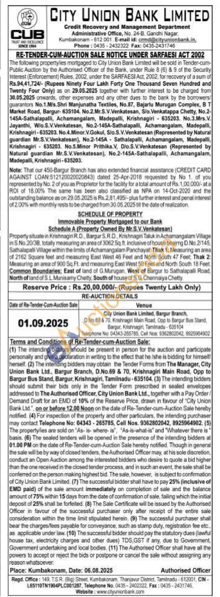 Property situate in Krishnagiri R.D. Bargur S.R.D., Krishnagiri Taluk in Achamangalam Village in S. No 20038, totally measuring an area of 3062 Sq.ft. inclusive of house beairng D.No 2/145, Sathalapalli Village within the limits of Achamangalam Panchayat. Thak 1: Measuring an area of 2162 Square feet and measuring East West 46 Feet and North South 47 Feet Thak 2 Measuring an area of 900 Sq Ft. and measuring East West 50 Feet and North South 18 Feet. Common Boundaries: East of land of G Munagan, West of Bargur to Sathalapali Road, North of land of SL Munisamy Chetty, South of house of S. G. Chennaiya Chetty
