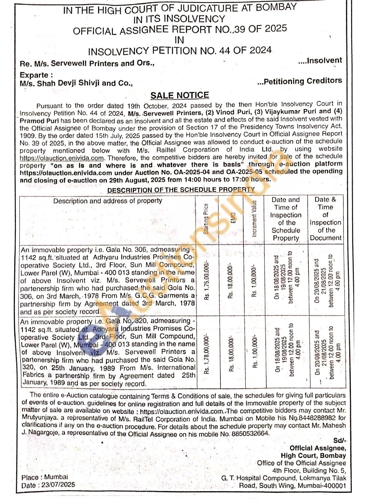 An immovable property i.e. Gala No. 306, admeasuring 1142 sq.ft. situated at Adhyaru Industries Promises Co-operative Society Ltd., 3rd Floor, Sun Mill Compound, Lower Parel (W), Mumbai - 400 013 standing in the name of above Insolvent viz. M/s. Servewell Printers a partenership firm who had purchased the said Gola No. 306, on 3rd March, 1978 From M/s. G.C.G. Garments a partnership firm by Agreement dated 3rd March, 1978 and as per society record
