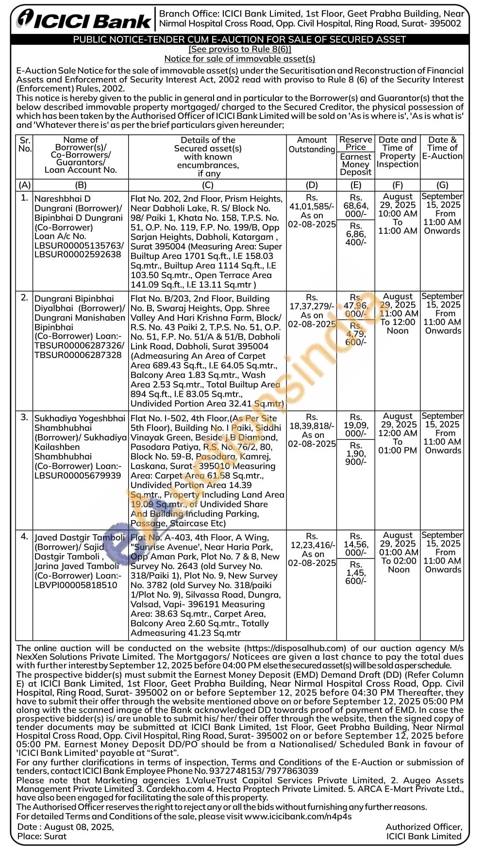 Flat No. 1-502, 4th Floor, (As Per Site 5th Floor), Building No. I Paiki, Siddhi Vinayak Green, Beside J.B Diamond, Pasodara Patiya, R.S. No. 76/2, 80, Block No. 59-B, Pasodara, Kamrej, Laskana, Surat- 395010 Measuring Area: Carpet Area 61.58 Sq.mtr., Undivided Portion Area 14.39 Sq.mtr., Property Including Land Area 19.09 Sq.mtr., of Undivided Share And Building Including Parking, Passage, Staircase Etc)