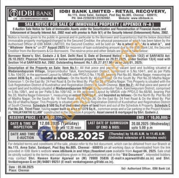 Description of the Property on Sale: Item No.1:- All that piece and parcel of vacant land and building situated at Madanandapuram Village, Sriperumbudur Taluk, Kancheepuram District, comprised in S.No. 104/1, and as per Patta S.No. 104/20, in the approved Layout by MMDA vide PPD/LO No. 176/88, bearing Plot No.60. Madha Nagar, measuring an extent 3036 Sq.ft., and bounded as follows:- On the North By: 40 Feet Road, On the South By: Plot No.33 Madha Nagar Extension 1: On the East By: 24 Feet Road & On the West By: Plot No.59 of Madha Nagar, This Property is situated with the Sub Registration District of Kundrathur and Registration District of South Chennai, Item No.2:- All that piece and parcel of vacant land and building situated at Madanandapuram Village, Sripenumbudur Taluk, Kancheepuram District, comprised in S.No. 109/1, and as per Patta S.No. 109/1A2, in the approved Layout by MMDA vide PPD/LD No.66/90, bearing Plot No. 33, Madha Nagar Extension 1, measuring an extent 2594 Sq.ft., and bounded as follows:-On the North By: Plot No.60 of Madha Nagar, On the South By: 16 Feet Road and Plot No 36: On the East By: 24 Feet Road & On the West By: Plot No.59 of Madha Nagar: This Property is situated with the Sub Registration District of Kundrathur and Registration District of South Chennai Schedule B 500 Sq.ft of Undivided share of land from and out of the Schedule A Property Schedule C