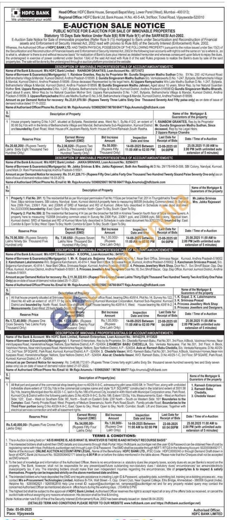 Property 1: Flat No. 201: 1) The residential flat as per Municipal permission Flat No: 115(as per broacher Flat 201 in Thungabhadra Tower) second floor, Silpa rainbow towers, SBI colony, Nandyal town, Kurnool district A property here to measuring 985Sft (including Common Area), In Surveys Nos 2306 Pyki, 2306/1 Pyki, and 2306/6 of SRD of Nandyal and RD of Kurnool. (More fully described in Schedule in sale deed document No.2223/2006) bounded by: East: Open To Sky, West comidor, North: Open To Sky, South: Open To Sky