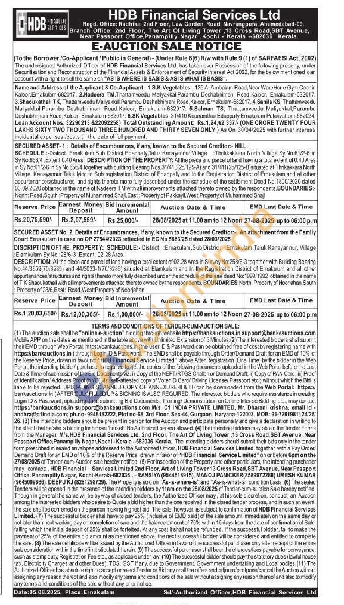 DESCRIPTION: All the piece and parcel of land having a total extent of 02.28 Ares in Survey No: 258/6-3 together with Building Bearing No:44/3659(70/3285) and 44/3033-1(70/3286) situated at Elamkulam and in the Registration District of Ernakulum and all other appurtenances/structures and rights thereto more fully described under the schedule of the sale deed No: 1999/1992 obtained in the name of T K Shaoukathaill with all improvements attached thereto owned by the respondents. BOUNDARIES: North: Property of Noorjahan, South Property of 28/6, East: Road, West Property of Noorjahan