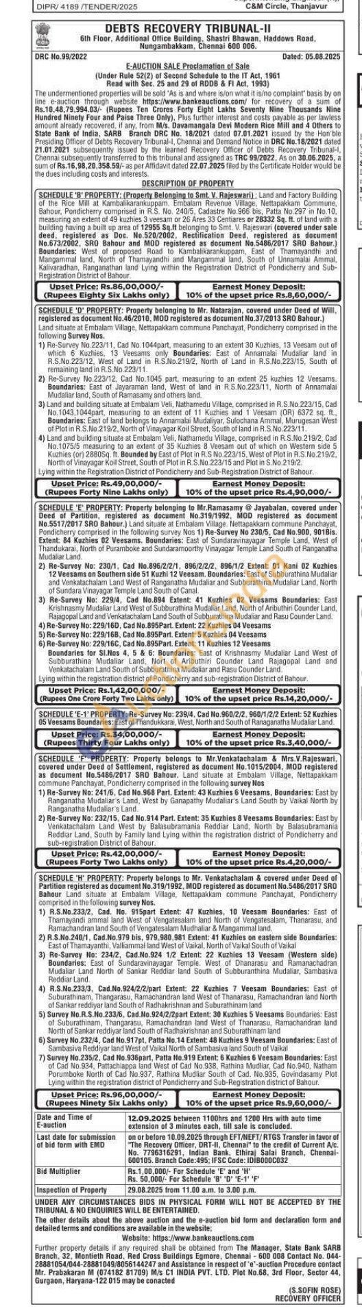 SCHEDULE 'B' PROPERTY: (Property Belonging to Smt. V. Rajeswari): Land and Factory Building of the Rice Mill at Kambalikarankuppam. Embalam Revenue Village, Nettapakkam Commune, Bahour, Pondicherry comprised in R.S. No. 240/5, Cadastre No.966 bis, Patta No.297 in No.10, measuring an extent of 49 kuzhies 3 veesam or 26 Ares 33 Centiares or 28332 Sq. ft. of land with a building having a built up area of 12955 Sq.ft belonging to Smt. V. Rajeswari (covered under sale deed, registered as Doc. No.520/2002, Rectification Deed, registered as document No.673/2002, SRO Bahour and MOD registered as document No.5486/2017 SRO Bahour.) Boundaries: West of proposed Road to Kambalikarankuppam, East of Thamayandhi and Mangammal land, North of Thamayandhi and Mangammal land, South of Unnamalai Ammal, Kalivaradhan, Ranganathan land Lying within the Registration District of Pondicherry and Sub-Registration District of Bahour.
