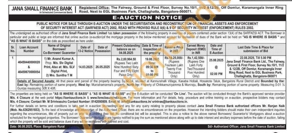 Details of Secured Assets: All that piece and parcel of the property bearing Sy.No.04, situated at Kannurahalli Village, Kasaba Hobali, Hosakote Taluk, Bangalore Rural District and Bounded by the: East by: Remaining portion of same property, West by: Munishamanna's property, North by: Property of Chikkamuniyamma & Muniraju, South by: Remaining portion of same property. Measuring 0-01 % Guntas measuring 30ft X 40ft.