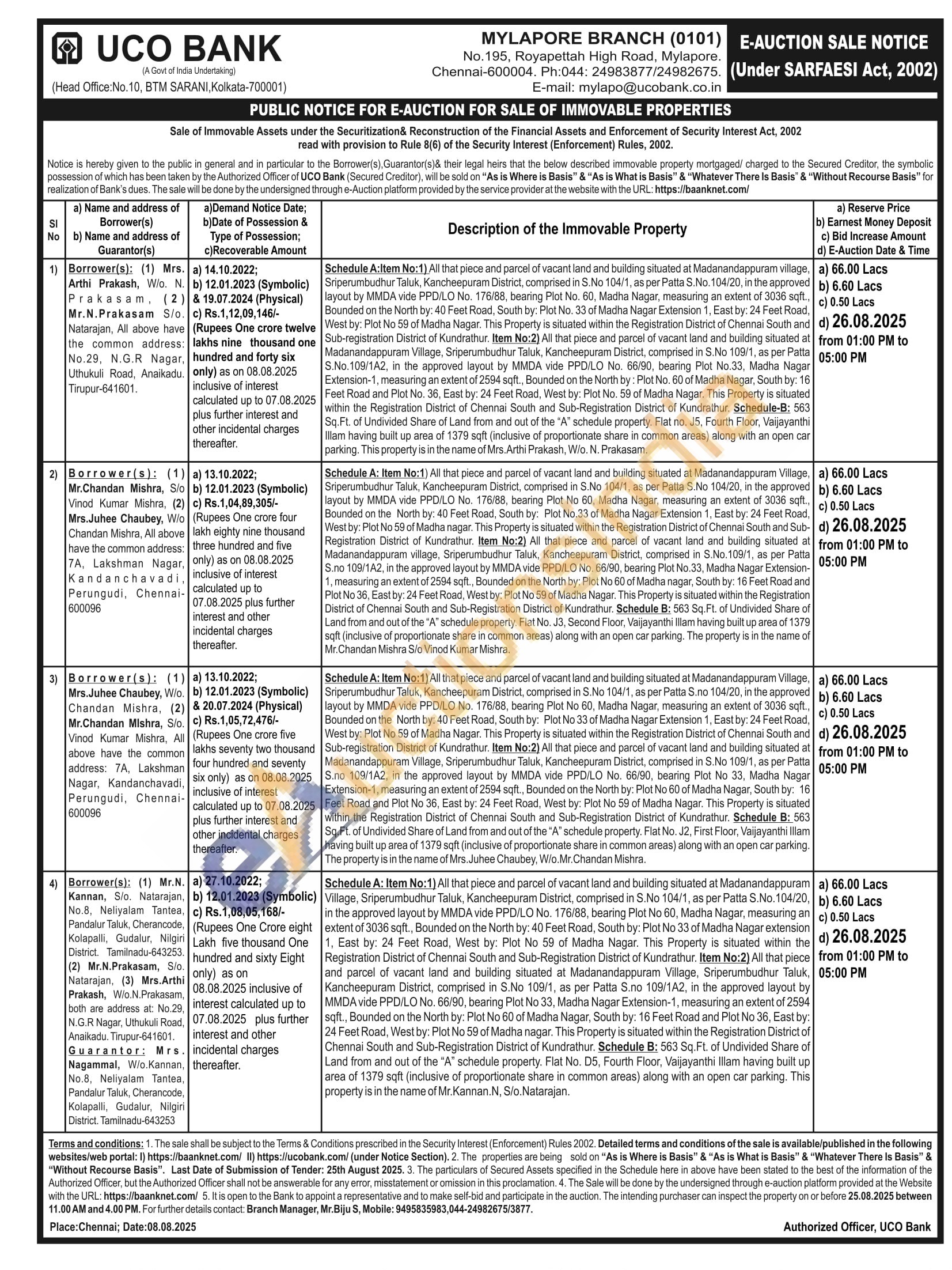 Schedule A:Item No:1) All that piece and parcel of vacant land and building situated at Madanandappuram village, Sriperumbudhur Taluk, Kancheepuram District, comprised in S.No 104/1, as per Patta S.No. 104/20, in the approved layout by MMDA vide PPD/LO No. 176/88, bearing Plot No. 60, Madha Nagar, measuring an extent of 3036 sqft., Bounded on the North by: 40 Feet Road, South by: Plot No. 33 of Madha Nagar Extension 1, East by: 24 Feet Road, West by: Plot No 59 of Madha Nagar. This Property is situated within the Registration District of Chennai South and Sub-registration District of Kundrathur. Item No:2) All that piece and parcel of vacant land and building situated at Madanandappuram Village, Sriperumbudhur Taluk, Kancheepuram District, comprised in S.No 109/1, as per Patta S.No.109/1A2, in the approved layout by MMDA vide PPD/LO No. 66/90, bearing Plot No.33, Madha Nagar Extension-1, measuring an extent of 2594 sqft., Bounded on the North by: Plot No. 60 of Madha Nagar, South by: 16 Feet Road and Plot No. 36, East by: 24 Feet Road, West by: Plot No. 59 of Madha Nagar. This Property is situated within the Registration District of Chennai South and Sub-Registration District of Kundrathur. Schedule-B: 563 Sq.Ft. of Undivided Share of Land from and out of the "A" schedule property. Flat no. J5, Fourth Floor, Vaijayanthi Illam having built up area of 1379 sqft (inclusive of proportionate share in common areas) along with an open car parking. This property is in the name of Mrs. Arthi Prakash, W/o. N. Prakasam.