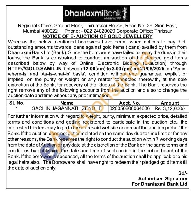 Dhanlaxmi Bank Gold Auctions Auction in Thrissur